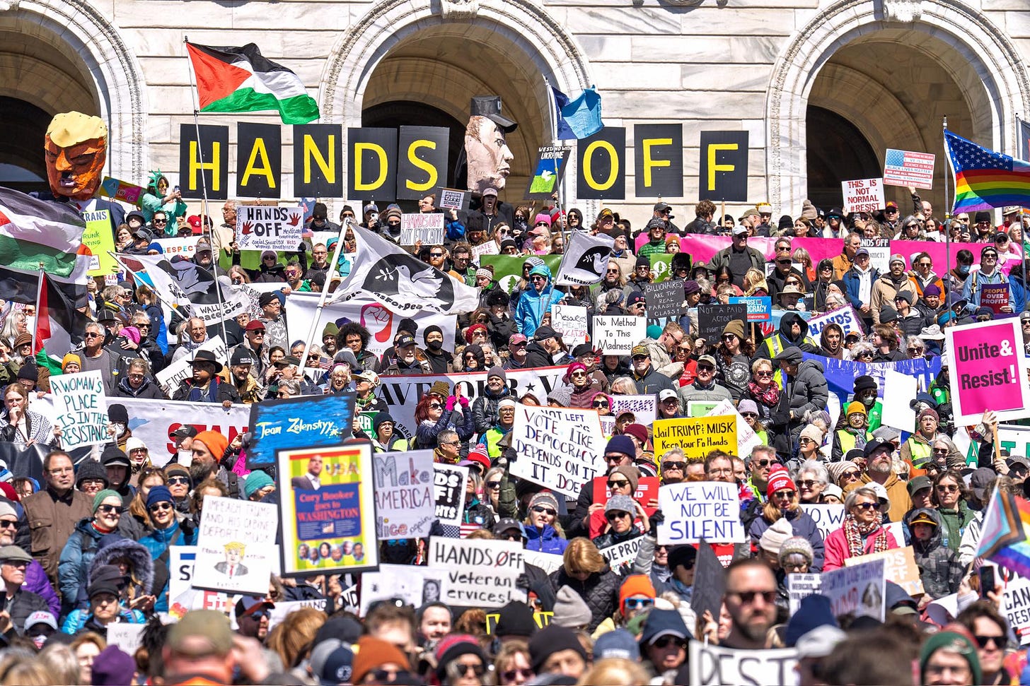 On April 1 I was up to my neck working with a team of about 20 activists planning the huge Hands Off! Rally that would be held at the Minnesota State Capitol on Saturday, April 5. And huge it was - about 43,000 people showed up even though that count was misrepresented in the media. There were hundreds of protests that day all over the country. Many people at the St. Paul event said it was the first time they had ever attended a protest of any kind.